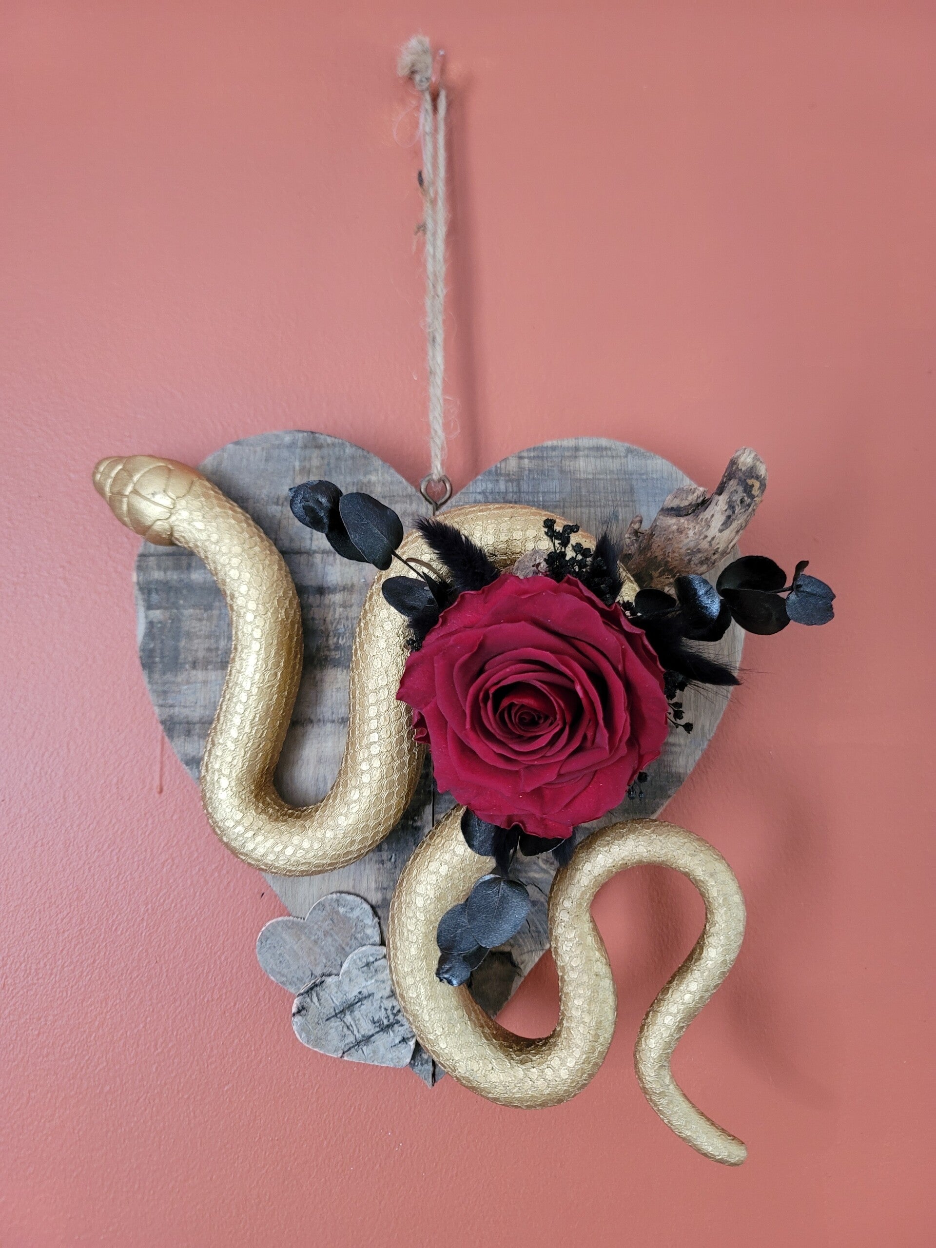 Serpent sur cœur en bois et rose eternelle